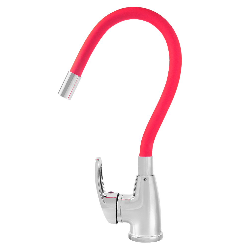 Однозахватный смеситель FLOE FK234-GR для кухни с боковым расположением ручки и гибким красным изливом.